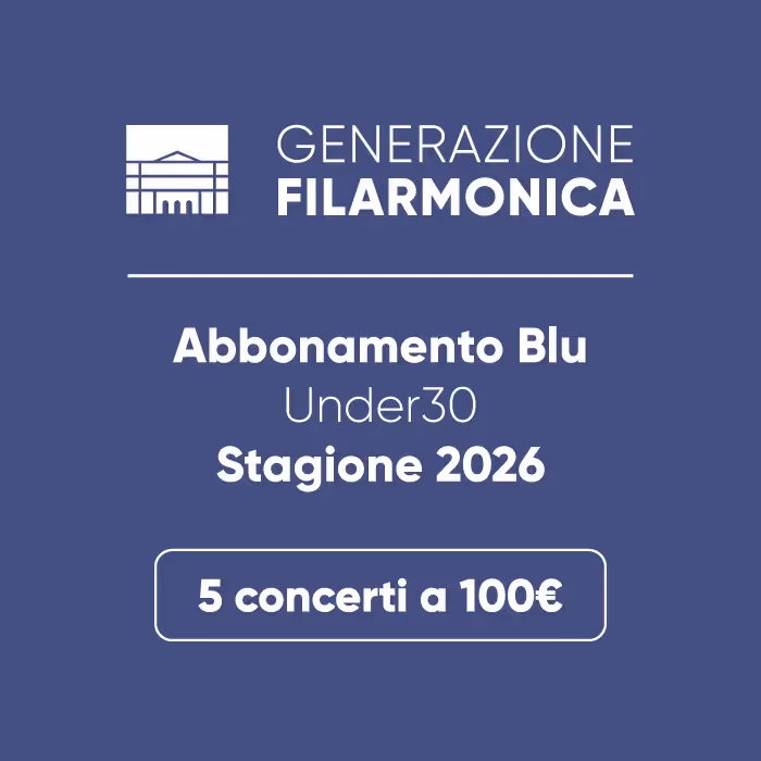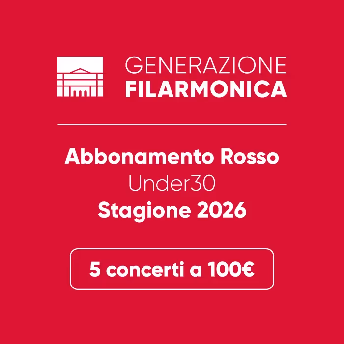 Gli abbonamenti Generazione Filarmonica sono strettamente personali e non cedibili se non a spettatori che abbiano i requisiti della promozione (Under30). Per l’acquisto è necessario inserire la data di nascita. Per l’ingresso a Teatro potrebbe essere richiesto un documento comprovante i requisiti. Per ulteriori informazioni +39 02 72 02 36 71 e su www.filarmonica.it.